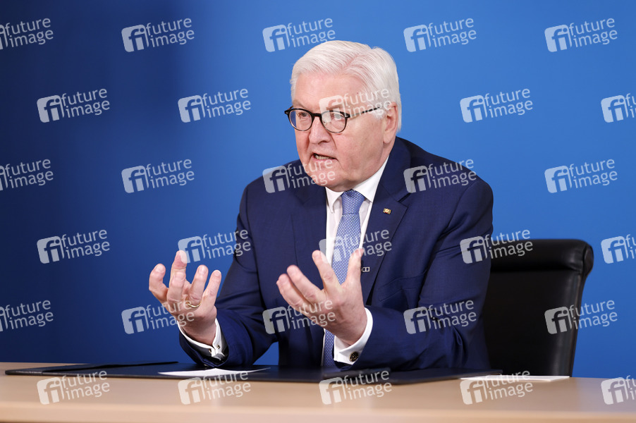 Frank-Walter Steinmeier bei der Vorstellung eines Kurzfilms über die Villa Hammerschmidt in Bonn und anschließendem Videogespräch mit der Bonner Oberbürgermeisterin Katja Dörner und dem Präsidenten der Stiftung Haus der Geschichte, Hans Walter Hütter, im Schloss Bellevue. Berlin, 01.06.2021