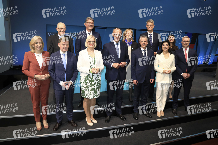 Nina Warken, Johann David Wadephul, Michael Meister, Christiane Schenderlein, Wolfram Weimer, Friedrich Merz, Karin Prien, Thorsten Frei, Patrick Schnieder, Katherina Reiche, Serap Güler und Karsten Wildberger bei der Tagung vom Bundesausschuss der CDU Deutschlands im Estrel Berlin. Berlin, 28.04.2025