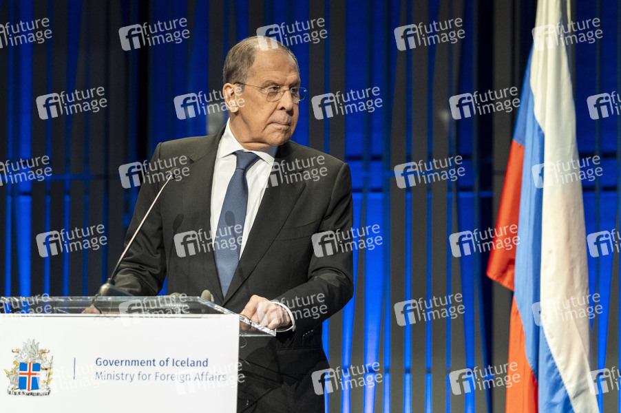 Außenminister Sergei Lawrow / Sergey Lavrov (Russland) während der abschließenden Pressekonferenz anlässlich der 12. Sitzung des Arktischen Rats und der Übergabe der Ratspräsidentschaft an Russland. Reykjavík, 20.05.2021