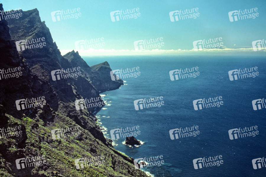 Gran Canaria, Spanien, Roque El Herero, Teneriffa, El Teide, Vulkan, Meer, Atlantik, Blau, Fernsicht, Felsen, Steilkueste, Gegenlicht, Brandung