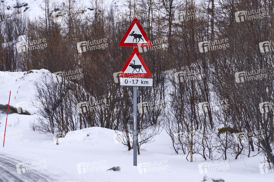 Warnschilder Rentiere und Elche am Fiischerdorf Sommaroy, 22.02.2022