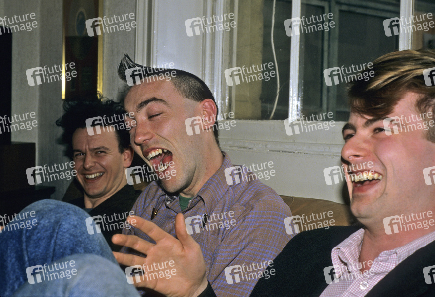 Kev Hopper, Mick Lynch und Chris Salmon von Stump bei einem Pressetermin im Büro ihrer Plattenfirma. London, 21.05.1987