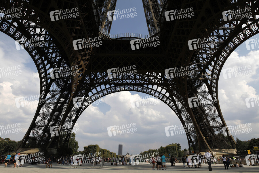 Der Eiffelturm gesehen von unten. Der Eiffelturm ist ein 324 Meter hoher Eisenfachwerkturm in Paris. Er steht im 7. Arrondissement am nordwestlichen Ende des Champ de Mars, nahe dem Ufer der Seine. Paris, 01.08.2019