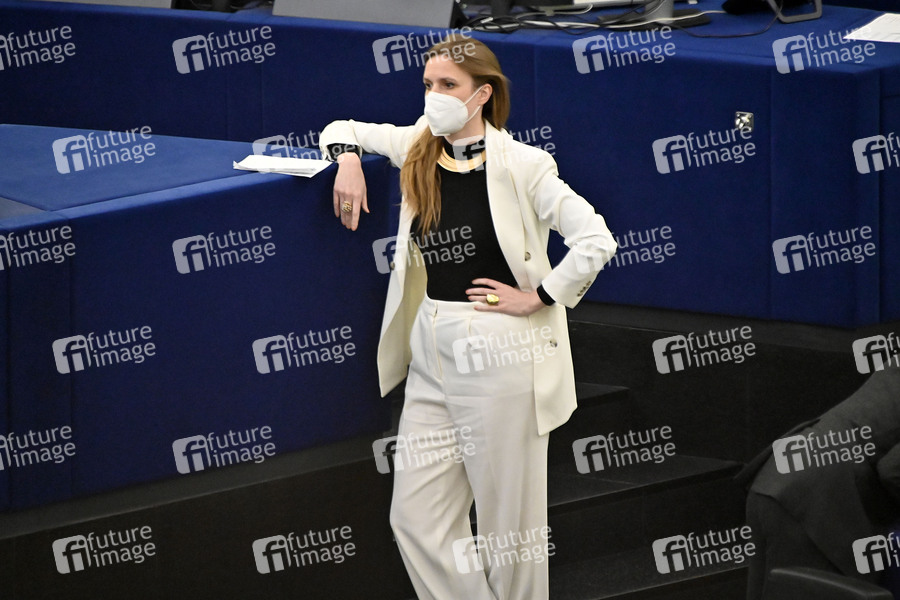 Terry Reintke bei einer Plenartagung mit Laufenden Anhörungen gemäß Artikel 7 Absatz 1 EUV zu Polen und Ungarn im Plenarsaal des Europäischen Parlaments. Straßburg, 06.04.2022
