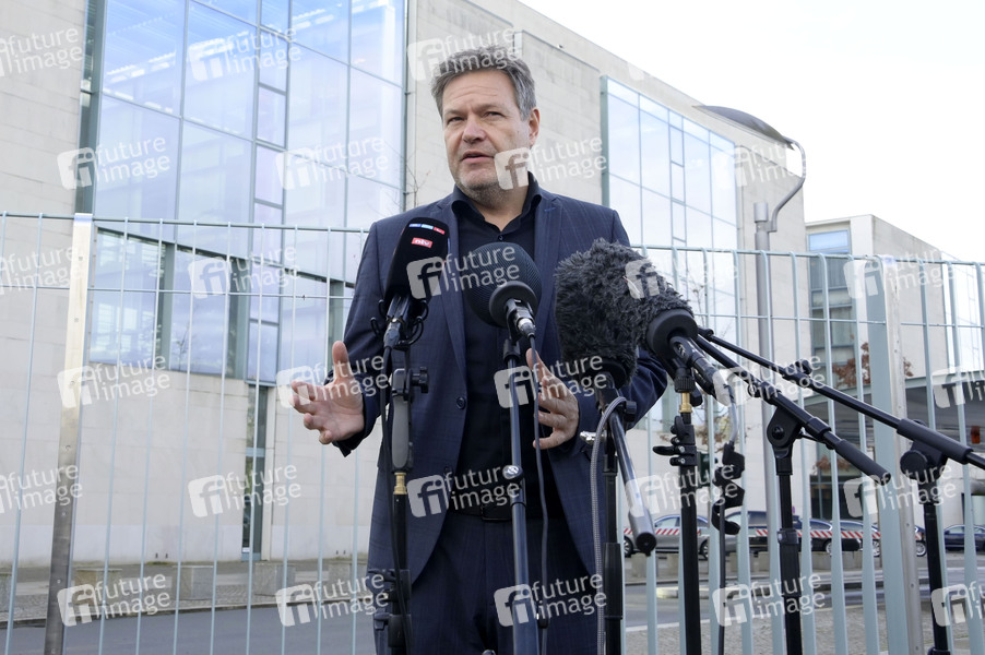 Robert Habeck bei einem Pressestatement zum Investitionsprüfverfahren zum geplanten Verkauf der Chip-Fertigung des Dortmunder Unternehmens Elmos und der Firma ERS Electronic an chinesische Firmen vor dem Bundeskanzleramt. Berlin, 09.11.2022