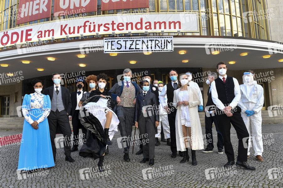 Vanessa Rottenburg, Frederic Brossier, Oliver Dupont, Michaela Hanser, Birthe Wolter, Dirk Schoedon, Peer Martiny, Adisat Semenitsch, Robert Kowarik, Lorris Andre Blazejewski, Esther Agricola, Martin Woelffer, Philip Butz u.a. beim Fototermin mit dem (getesteten) Ensemble des Theaterstücks 'Vorhang auf für Cyrano' in Maske und Kostüm vor dem Testzentrum im Schiller Theater. Unter dem Motto 'Testen statt spielen' eröffnen die Komödie am Kurfürstendamm und der KitKatclub ein gemeinsames Testzentrum im Schiller Theater. Berlin, 07.04.2021