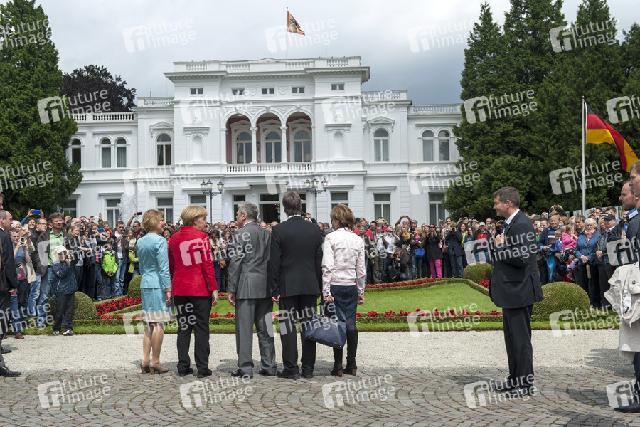 Daniela Schad, Angela Merkel, Joachim Gauck und Juergen Nimptsch mit Gattin vor der Villa Hammerschmidt am Tag der offenen Tür in der Villa Hammerschmidt und dem Palais Schaumburg. Bonn, 29.06.2013