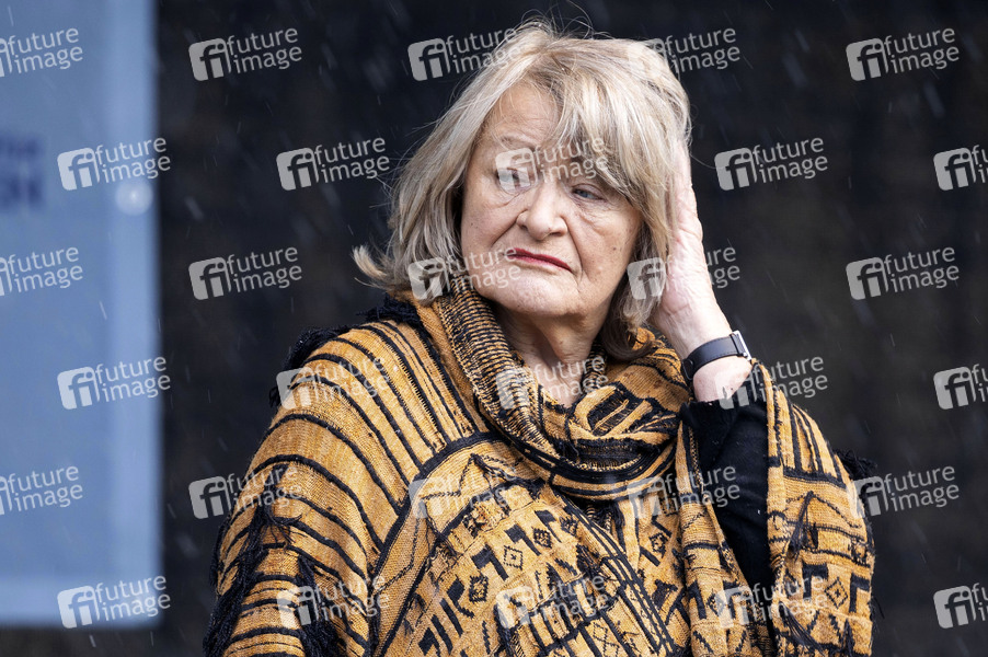 Alice Schwarzer auf der umstrittenen Friedensdemo und Kundgebung für Verhandlungen mit Russland statt Waffenlieferungen für die Ukraine am Brandenburger Tor. Dazu aufgerufen haben die Linken-Politikerin Sahra Wagenknecht und die Frauenrechtlerin Alice Schwarzer. Berlin, 25.02.2023