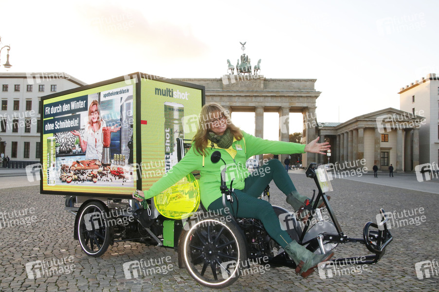 Maren Gilzer bei der Präsentation ihres gesundheitsfördernden Superfoodsaftes von multishot am Brandenburger Tor. Berlin, 20.11.2020