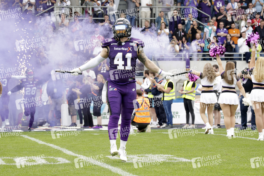 Sebastian Gauthier (Frankfurt Galaxy LB) beim American Football-Spiel Frankfurt Galaxy gegen Hamburg Sea Devils in der PSD Bank Arena. Frankfurt am Main, 30.06.2024
