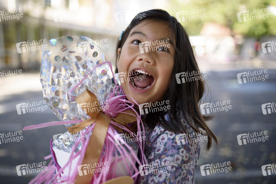 Ein junges Mädchen bekommt zum ersten Schultag bzw. zu ihrer Einschulung in die Grundschule eine Schultüte. (Model Release, Themenbild, Symbolbild) Nürnberg, 15.09.2021