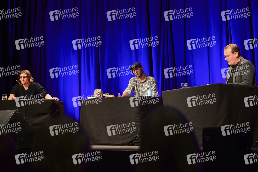 Jonas Dassler, Lenny Mockridge und Devid Striesow bei der szenisch-musikalischen Lesung aus Steinbecks Roman 'Von Mäusen und Menschen' im Kulturzentrum Pavillon. Hannover, 21.09.2024