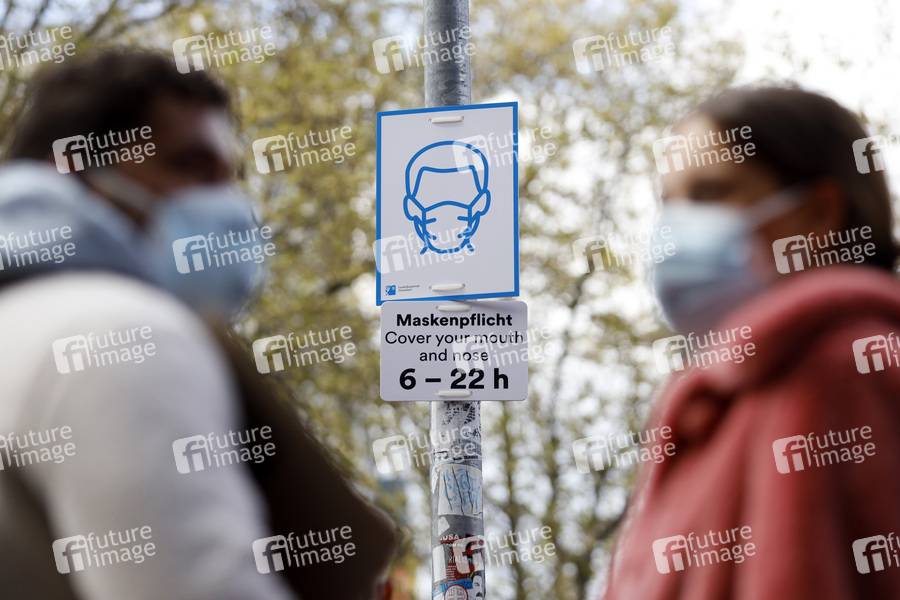 Ein Schild weist Teilnehmer einer Demo auf die Maskenpflicht vor dem Düsseldorfer Hauptbahnhof in der Zeit von 6 bis 22 Uhr hin. (Themenbild, Symbolbild) Düsseldorf, 01.05.2021