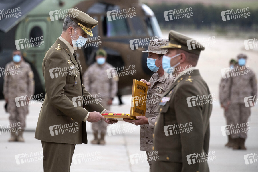 König Felipe VI. von Spanien beim Ehrenempfang auf der Torrejón Air Base für die letzten Soldaten die aus ihrem Einsatz in Afghanistan zurück kommen,. Die Beteiligung Spaniens am Krieg in Afghanistan begann am 27. Dezember 2001. Torrejón de Ardoz, 13.05.2021