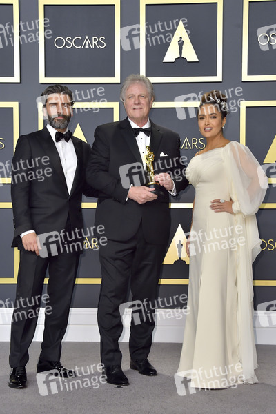 Oscar Isaac, Donald Sylvester (bester Tonschnitt bei 'Le Mans 66 - Gegen jede Chance / Ford v Ferrari') und Salma Hayek im Press Room der Oscar Verleihung 2020 / 92nd Annual Academy Awards im Hollywood & Highland Center. Los Angeles, 09.02.2020