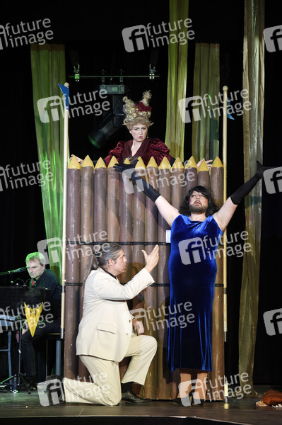 Aron Altmann, Constanze Lindner und Thomas Wenke bei der Generalprobe zum Streaming von 'Siegfried - Götterschweiß und Heldenblut, Ein Germanical' im Kleinen Theater. Haar, 07.03.2021