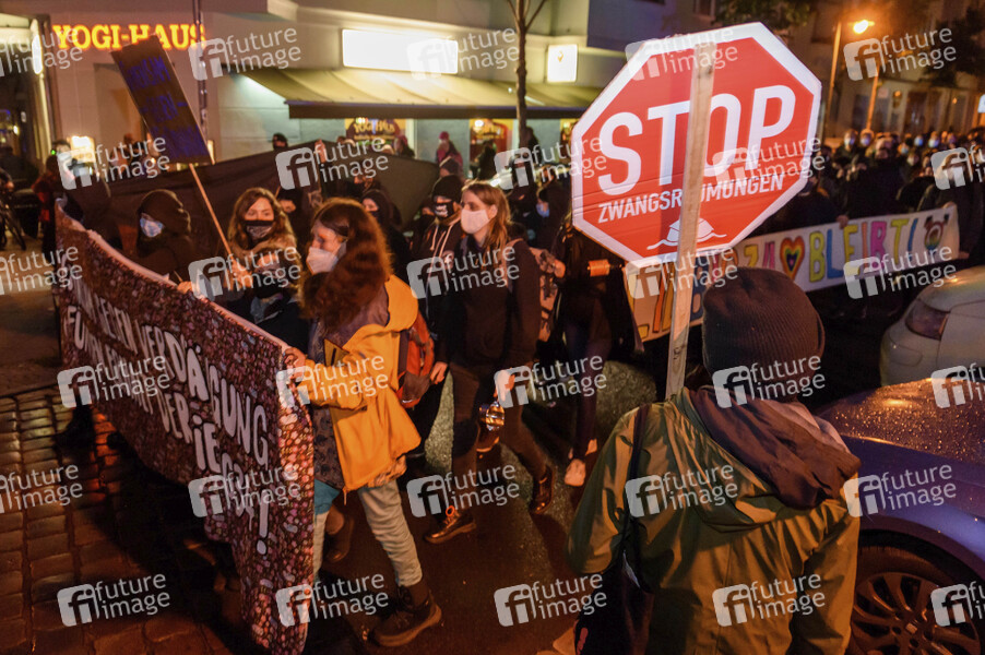 Anwohner und Nachbarn protestieren mit einer Demonstration gegen die bevorstehende Räumung des queer-feministischen Hausprojekts Liebig 34 (L34) in der Liebigstraße 34 in Berlin-Friedrichshain. Berlin, 08.10.2020
