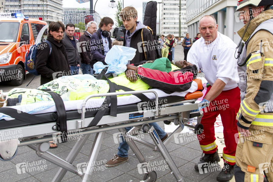 Ein Refugee wird von Sanitätern der Berliner Feuerwehr mit einem Rettungswagen ins Krankenhaus gebracht. Am Berlin Congress Center (bcc) befinden sich Flüchtlinge seit 6 Tagen im Hungerstreik. Sie fordern den Stopp aller Abschiebungen, dauerhafte Anerkennung des Aufenthaltes und die Aufhebung der Dublin-Verträge. Berlin, 08.05.2014