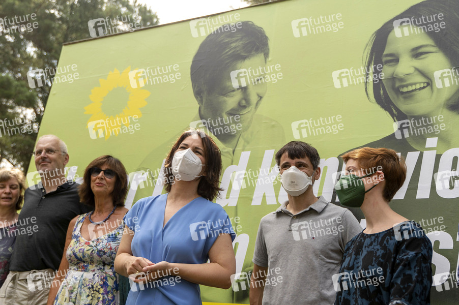Annalena Baerbock beim Wahlkampfauftakt von Bündnis 90/Die Grünen Brandenburg und der Enthüllung eines Großflächenplakats auf dem Goetheplatz in Wilhelmshorst. Michendorf, 26.07.2021