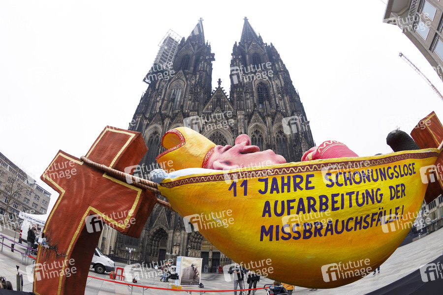 Eine Skulptur des Künstlers Jacques Tilly steht in der angemeldeten Demo 'Missbrauch in der Kirche' mit der Aufschrift '11 Jahre schonungslose Aufarbeitung der Missbrauchsfälle' vor dem Kölner Dom. Diverse Initiativen, die sich für Opfer von sexuellen Übergriffen durch Kirchenvertreter einsetzen, protestieren am Tag der Veröffentlichung des neuen Gutachtens zum Umgang mit sexuellem Missbrauch im Erzbistum Köln mit der Aufstellung gegen die schleppende Aufarbeitung von Missbrauchsfällen in der katholischen Kirche. Köln, 18.03.2021