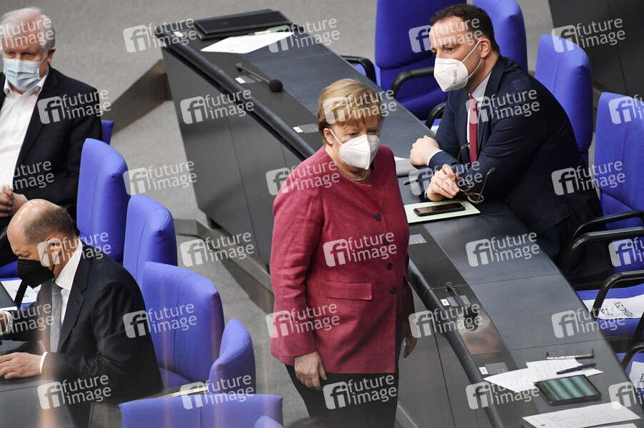 Horst Seehofer, Olaf Scholz, Angela Merkel und Jens Spahn in der 222. Sitzung des Deutschen Bundestages im Reichstagsgebäude. Berlin, 16.04.2021