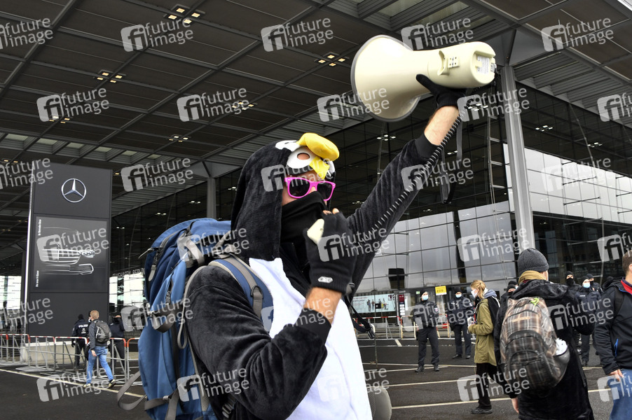 Klimaaktivisten der Aktionsgruppe 'Am Boden bleiben' protestieren gegen die Eröffnung des Flughafens Berlin-Brandenburg (BER). Schönefeld, 31.10.2020