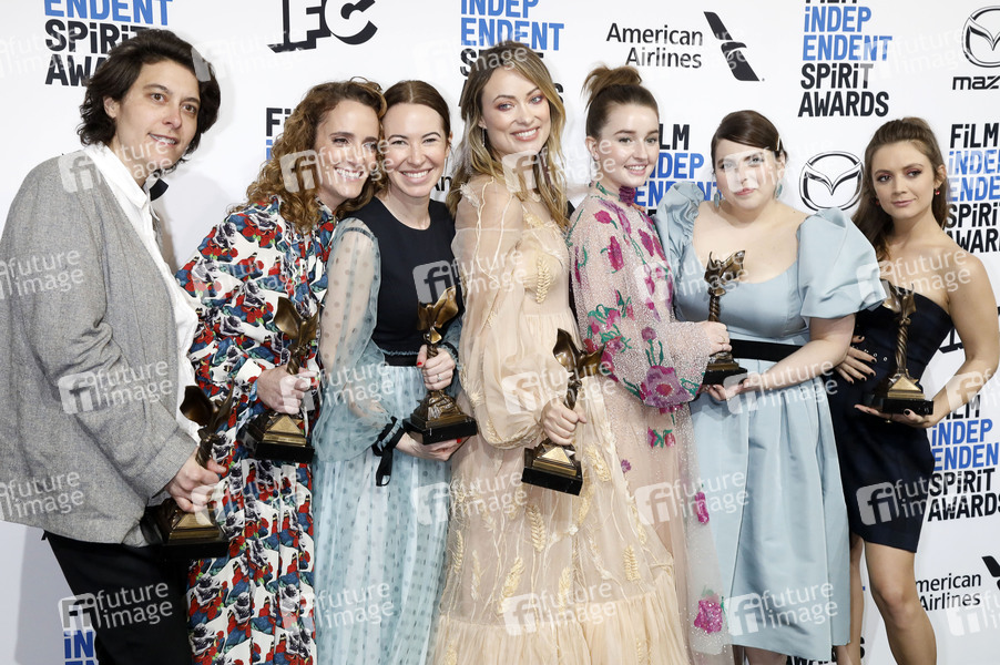Chelsea Barnard, Jessica Elbaum, Katie Silberman, Olivia Wilde, Kaitlyn Dever, Beanie Feldstein und Billie Lourd (bester Debütfilm 'Booksmart') beim Photocall mit den Preisträgern der 35. Verleihung der Film Independent Spirit Awards 2020 im Zelt am Santa Monica Beach. Santa Monica, 08.02.2020