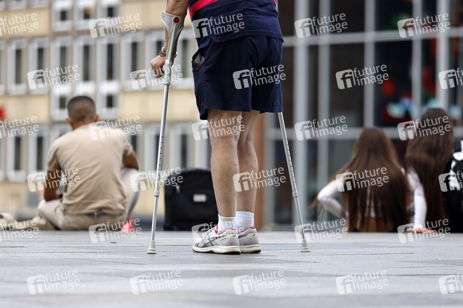 Ein Mann an Krücken bewegt sich langsam mit Pausen durch die Kölner Innenestadt. Bei der sogenannten Schaufensterkrankheit, oder Peripheren Arteriellen Verschlusskrankheit (PAVK), handelt es sich um eine Durchblutungsstörung der Beinschlagader. Krampfartige Schmerzen beim Gehen, die im Ruhezustand nachlassen, sind ein typisches Symptom. Arteriosklerose ist hierfür die Ursache. Betroffene müssen regelrecht an jedem Schaufenster stehenbleiben, weshalb PAVK auch Schaufensterkrankheit genannt wird. (Themenbild, Symbolbild) Köln, 11.06.2021
