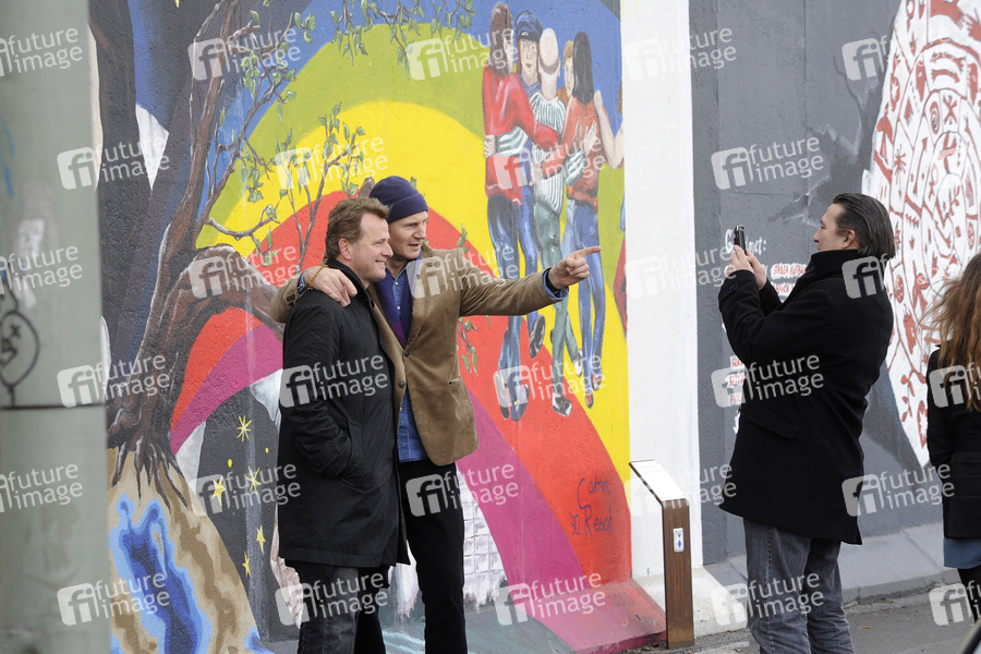 Liam Neeson besucht die Berliner Mauer an der East Side Gallery während einer Drehpause zu seinem Thriller 'Unknown Identity'