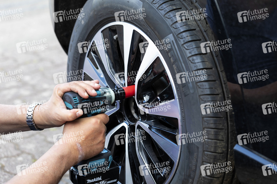 Radwechsel ist der Tausch kompletter Räder, also Reifen auf Felgen, bei Kraftfahrzeugen, wie er beim Wechsel zwischen Sommer- und Winterreifen vorgenommen wird. Zum Anheben des Fahrzeugs wird ein Wagenheber verwendet. Die Radmuttern werden mit Hilfe eines Kreuzschlüssels, eines Drehmomentschlüssels oder vergleichbarem Werkzeug gelöst und angezogen. (Symbolfoto, Themenfoto) Niedernwöhren, 01.06.2024