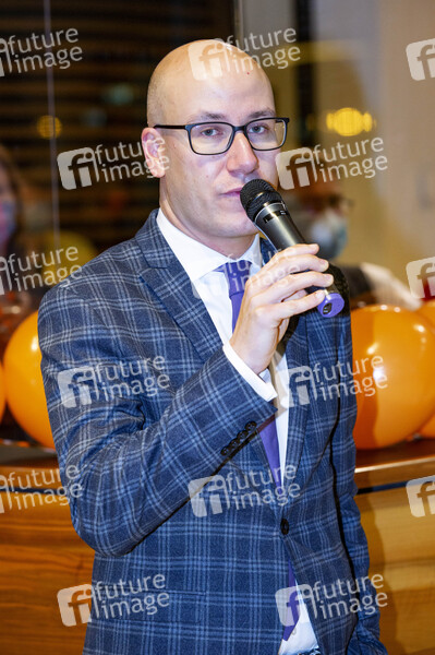 Stephan Erler beim allerersten kommerziellen Abflug vom BER mit easyJet nach London Gatwick am Gate im Non-Schengen-Bereich des Terminal 1 im Flughafen Berlin Brandenburg. Schönefeld, 01.11.2020