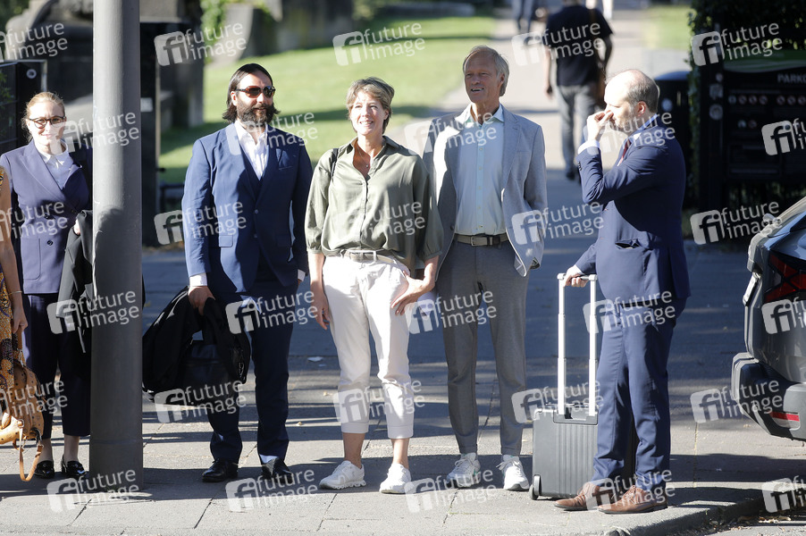 Christina Block und Gerhard Delling mit ihren Verteidigern Paula Wlodarek, Ingo Bott und David Rieks bei der Ankunft zum Prozess wegen mutmaßlicher Kindesentführung gegen Christina Block am Landgericht Hamburg. Hamburg, 19.08.2025
