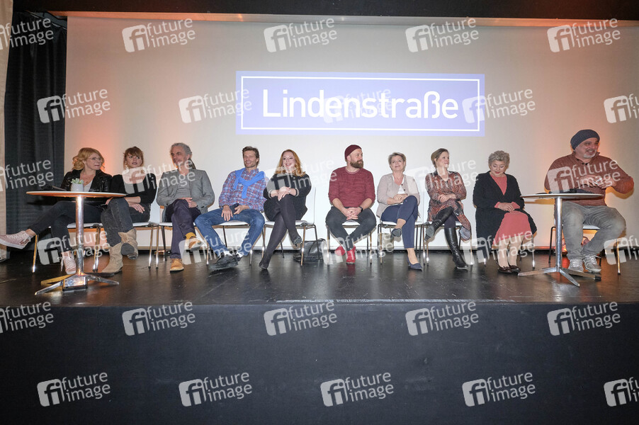 Jaqueline Svilarov, Cosima Viola, Moritz Zielke, Felix Maximilian, Rebecca Siemoneit-Barum, Moritz A. Sachs, Andrea Spatzek, Sybille Waury, Marie-Luise Marjan und Erkan Gündüz bei der Talk- und Lesereiehe 'Erleben & Erlesen' mit Darstellern der ARD TV-Serie 'Lindenstraße' im Maritim Airport Hotel. Hannover, 10.03.2020