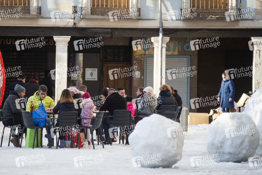 Plaza de Cervantes - Die Region Madrid nach dem Sturmtief Filomena, das in weiten Teilen Spaniens mit starken Schneefällen für Chaos sorgte. Starker Schneefall legte das öffentliche Leben nahezu lahm. Seit 50 Jahren hatte es nicht so geschneit. Alcalá de Henares, 10.01.2021