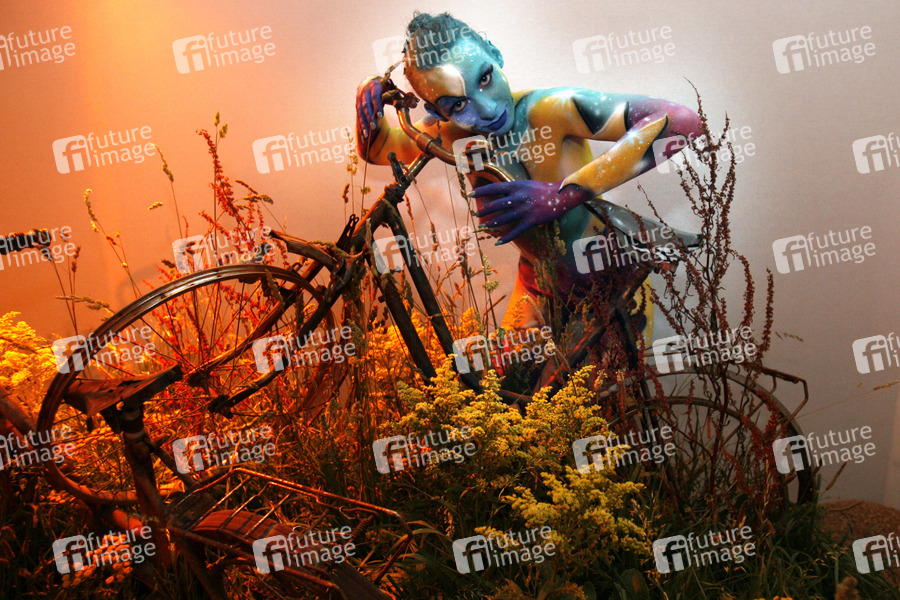 Bodypainting, Erotik, Frau, nackt, drinnen, weiblich, Blumen, Metall, Fahrrad, erotic, woman, nude, indoor, female, fowers, metal, bicycle, bike