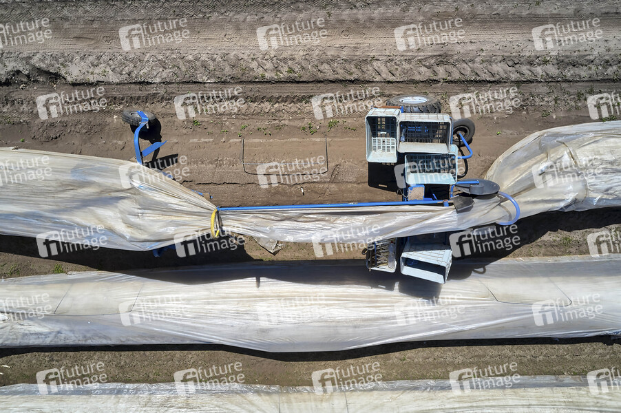 Spargelfeld, Spargel, Spargelfelder, Spargelernte, Gemüse, Erntehelfer, Feld, Luftbild, Luftaufnahme, Engels SpargelSpinne, Spargel Spinne, Spargelmashine