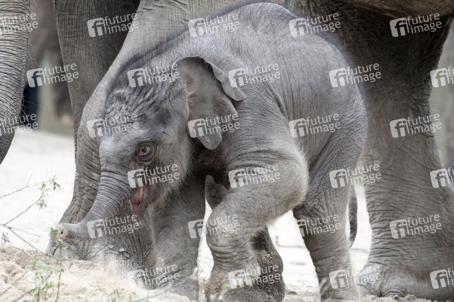 Der am 13. April geborene Elefant bei seinem ersten Freigang auf der 3000 Quadratmeter großen Außenanlage im Tierpark Hagenbeck, Hamburg