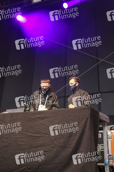 ESKEI83 und Purple Disco Machine bei einem fünfminütigen DJ-Set bei der Demonstration 'Ohne uns ist Stille' der Organisation 'Leere Stühle' auf dem Theaterplatz in der historischen Dresdner Altstadt. Künstler, Veranstalter und Unternehmen der Veranstaltungsbranche wie Caterer und Techniker demonstrieren gemeinsem, um auf die Probleme und Wichtigkeit ihrer Branche aufmerksam zu machen. Dredsen, 05.06.2020