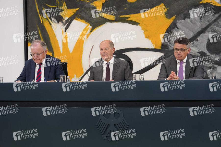 Stephan Weil, Olaf Scholz und Boris Rhein bei der Pressekonferenz im Anschluss an die Beratungen der Bundesregierung mit den Regierungschefinnen und Regierungschefs der Länder im Bundeskanzleramt. Berlin, 20.06.2024