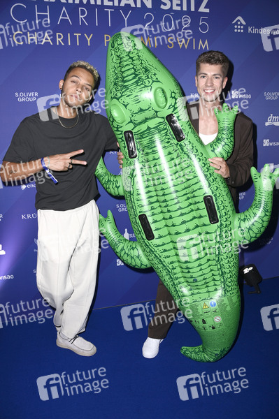 Malik Harris und Maximilian Seitz beim Charity Promi Swim Event 2025 von Maximilian Seitz zugunsten von 'Kindeswohl-Berlin' im Hotel Pullman Berlin Schweizerhof. Berlin, 24.07.2025