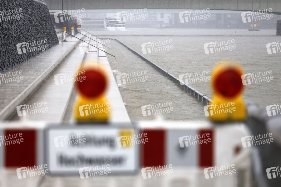 Anhaltende Regenfälle durch Tief Bernd haben in Köln und Umland zu Hochwasser, steigendem Rheinpegel und überfluteten Straßen, Kellern und Fahrbahnen geführt. Am Rheinboulevard überspülte das Wasser die Stufen. Feuerwehr und THW waren im Dauereinsatz. Der Deutsche Wetterdienst hatte zuvor vor extremen Dauerregen gewarnt. Köln; 14.07.2021