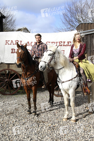 Schauspieler, Schauspielerin, Prominenz, Fototermin, Pressetermin, Photocall, Fotocall, Unterhaltung, Entertainment, Kultur, Western, Freilichtbühne, Freilichttheater, Freilufttheater, Kalkbergstadion, Open Air Theater, 68. Karl-May-Spiele 2019, Unter Geiern - Der Sohn des Bärenjägers, Tiere, Pferde