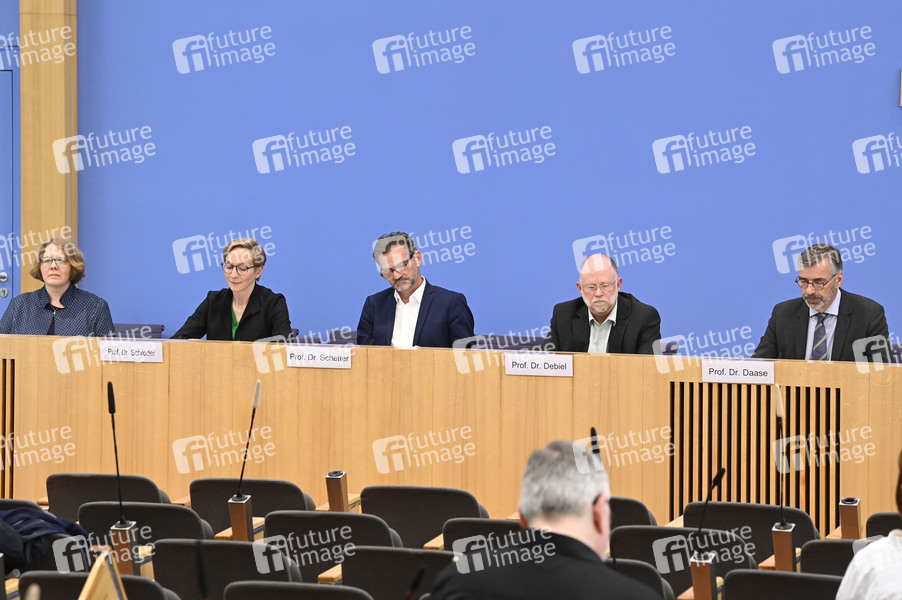 Claudia Baumgart-Ochse, Ursula Schröder, Conrad Schetter, Tobias Debiel und Christopher Daase bei der Bundespressekonferenz 'Friedensgutachten 2025' im Haus der Bundespressekonferenz. Berlin, 02.06.2025
