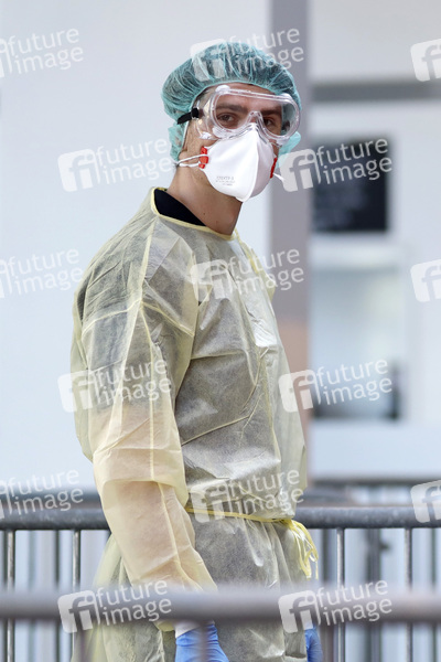 Die Stadt Köln hat ein drittes Infektionsschutzzentrum mit Mitarbeitern der Kölner Feuerwehr in Betrieb genommen, wo sich Bürger auf Covid-19 testen lassen können. Köln, 01.04.2020