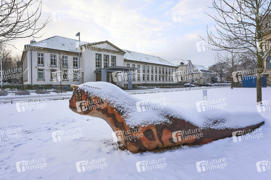 Verschneiter Dinosaurier am Landesmuseum zur Sonderausstellung 'Kinoaaurier. Zwischen Fantasie und Forschung'. Hannover, 30.01.2021