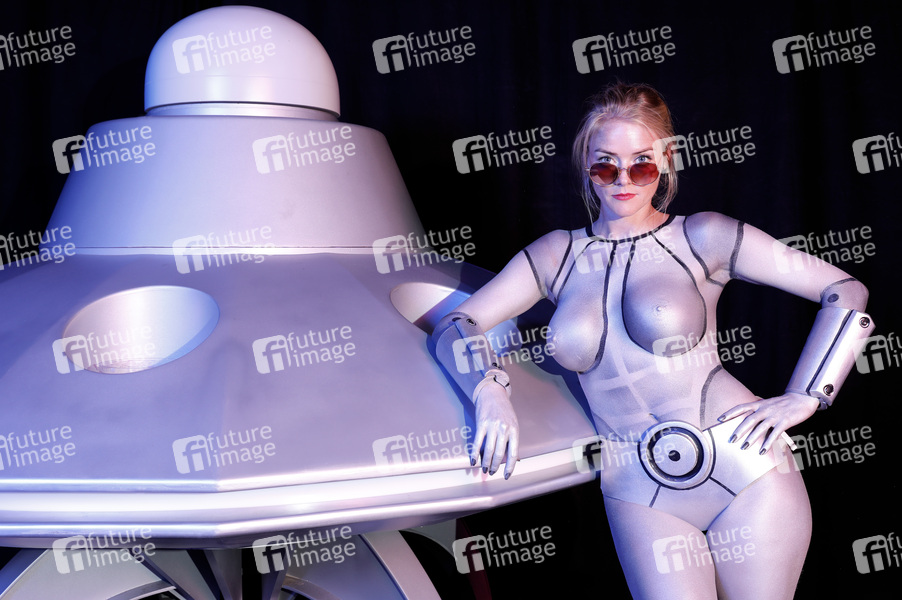 Projekt Farbkörper, Bodypainting, Body-Painting, Cosplay, Cosplayer, Körperkunst, Körperfarben, Farbe, Bemalung, Kunst, Make-up, Latexapplikationen, Maskenbildnerei, unbekanntes Flugobjekt, unidentifiziertes Flugobjekt, Außerirdische, fliegende Untertasse, Raumschiff, Fünfziger Jahre, Retro, Landung, Science Fiction, Pin-up, body painting, body art, latex applications, unknown flying object, spacecraft, flying saucer, landing, colors, fifties, alien, unidentified flying object