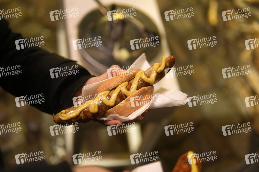 Brötchen mit Bratwurst auf dem Weihnachtsmarkt am Schloss Charlottenburg. Nach dem Anschlag auf dem Weihnachtsmarkt in Magdeburg hat die Polizei ihre Präsenz auf Weihnachtsmärkten in Berlin und Brandenburg verstärkt. .Berlin, 22.12.2024