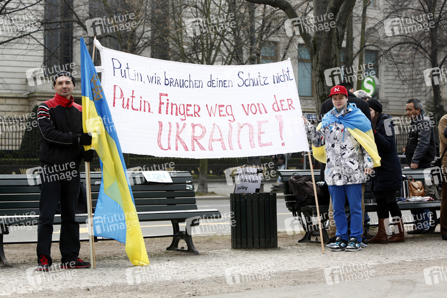 Ukrainer demonstrieren vor der Russischen Botschaft in Berlin gegen Russlands Aufmarsch vor der Krim. Berlin, 04.03.2014
