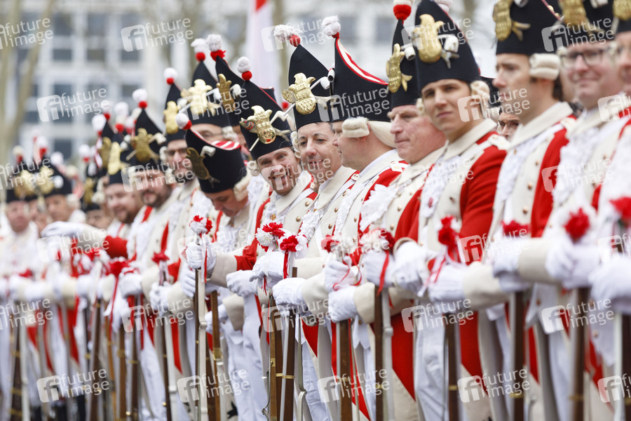 Kostüm, Karnevalsverein, Traditionscorps, Karneval, Köln, Karneval in Köln, Karnevalssamstag 2018, Karneval 2018, Kölner Karneval, Neumarkt, Funken-Biwak, Funkenbiwak, Rote Funken, Narren, Jecken, Kostüme, Alaaf, Kölle Alaaf, Kamelle, Tradition, Session, Sessionsmotto, Tanzpaar, Funkenmariechen, Tanzmariechen, Jecke, Jeck, Kölscher Karneval, Straßenkarneval, Fastelovend, Cologne Carnival, Spaßkultur, Brauchtum, Kölsche Funke rut-wieß vun 1823 e. V., Ehrengarde, Dienstgarde, Männerverein, Corps, Regiment, Uniform, Vereinsleben, Vereinskultur, Karnevalsvereine, Symbolbild, Symbolfoto