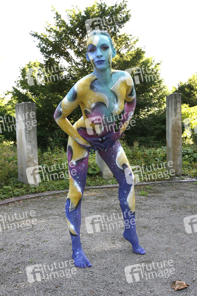 Bodypainting und Fotoshooting mit Model Sarah am Tag der offenen Tür der Meisterschule Justus-von-Liebig-Schule, Abteilung Floristik in Hannover-Ahlem. Künstler: Jörg Düsterwald